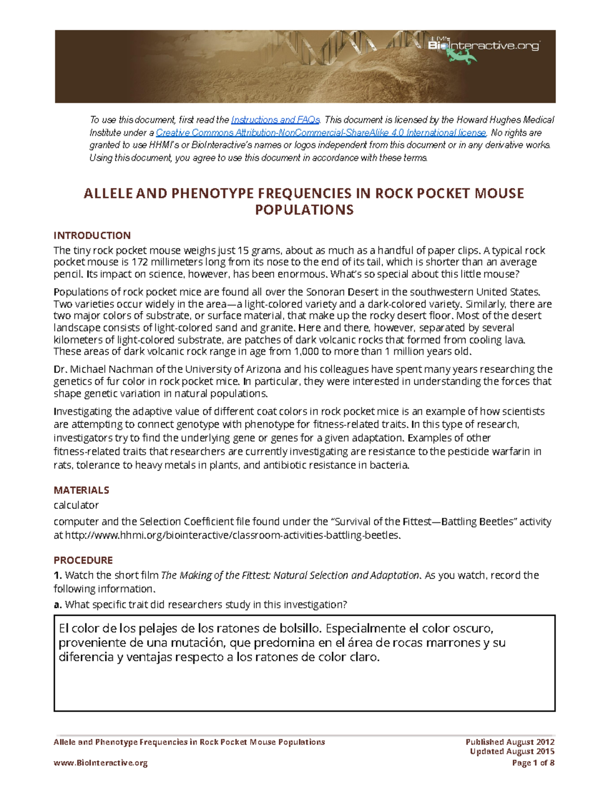 Allele And Phenotype Frequencies In Rock Pocket Mouse Populations